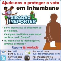 O jornal @Verdade está a trabalhar no sentido de monitorar todo o período de campanha, a votação e o apuramento dos resultados. Contamos com a colaboração de todos os cidadãos, particularmente aqueles que estão em Inhambane, para ajudarem-nos reportando qualquer irregularidade que presenciem através das várias plataformas que temos disponíveis. Por mensagem de texto de telemóvel SMS 821111, para o email autarquicas2011@averdadeonline.com, através de um tuit para @verdade, no nosso mural do facebook.com/JornalVerdade ou ainda por mensagem de telemóveis blackberry adicionando o nosso (PIN 28B9A117).