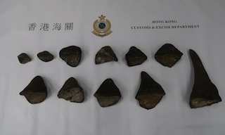 Um jovem de 21 anos de idade, cuja nacionalidade não foi divulgada, foi detido pelas alfândegas do Aeroporto Internacional de Hong Kong na posse de onze pedaços de cornos de rinocerontes pesando sete quilogramas.