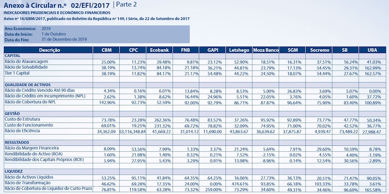 O melhor rácio passou a ser do Banco de Investimento Global, aumentou de 87,73 para 194,71 por cento, entre o 1º e o 4º trimestre de 2019. O segundo melhor rácio de solvabilidade pertence ao United Bank for Africa Moçambique, 162,99 por cento, Ecobank, 84,18 por cento.