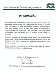 Através de um ofício distribuído interinamente, e que o @Verdade teve acesso e confirmou a sua autenticidade, o Conselho de Administração das TDM informa aos seus “colaboradores que o pagamento do salário do corrente mês de Outubro/17, está ligeiramente atrasado, relativamente à data limite prevista de 30 de cada mês, devido às limitações de disponibilidade de tesouraria”.