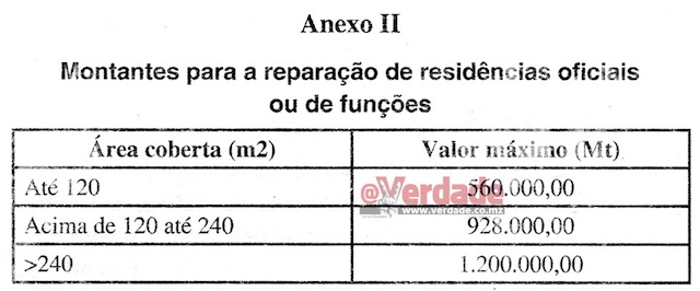 Este Diploma Ministerial, publicado a 31 de Julho último mas que é aplicável desde 1 de Janeiro de 2018, definiu ainda que essa compensação será de 500 mil Meticais para Dirigentes Superiores do Estado ou Titulares de Cargos Governativos e de 150 mil Meticais para os demais beneficiários do direito à habitação por conta do Estado.