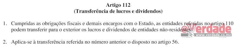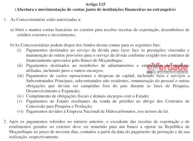 Outra alteração favorável às petrolíferas é estabelecida pelo artigo 115 que garante às Concessionárias de Petróleo e Gás a possibilidade de “Abrir e manter contas bancárias no exterior para receber receitas de exportação, desembolsos de créditos externos e investimento”, algo que na legislação anterior estava sujeita à autorização do Banco de Moçambique.