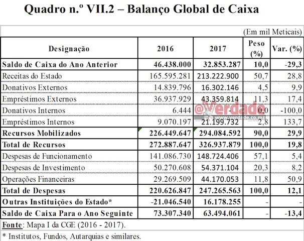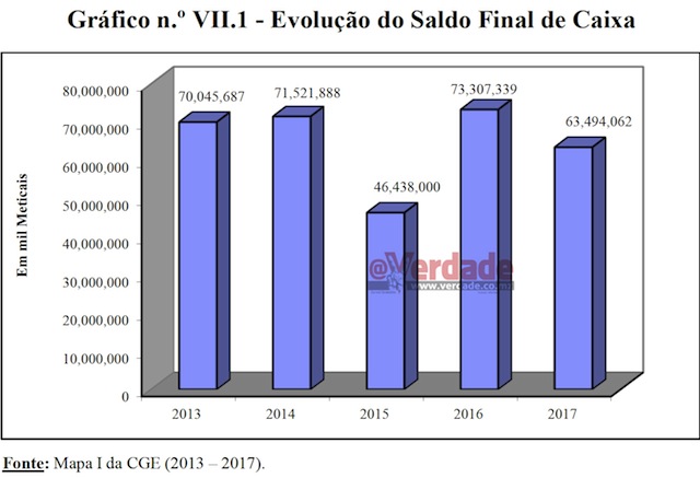 Nessas contas em bancos comerciais, e ignorando de forma reiterada as recomendação que o TA tem feito desde 2014, “é na CUT que devem estar centralizadas as receitas arrecadadas, tanto internas como externas, bem como o pagamento das despesas públicas, independentemente da sua natureza”, existiam a 31 de Dezembro de 2017 mais de 63,4 biliões de meticais, valor que corresponde a cerca de 80 por cento de todo o défice do OE e que seria mais do suficiente para suprir o défice existente para a realização das Eleições Gerais, garantir a importação de medicamentos durante mais do que 2 anos, construir hospitais, escolas e quiçá iniciar a reabilitação da destruída cidade da Beira.