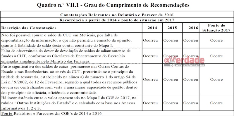 Na seu Parecer Sobre a Conta Geral do Estado de 2017 o Tribunal Administrativo observa o incumprimento reiterado das suas recomendações “subsistindo a urgente necessidade de tomada de medidas concretas para a melhoraria do Sistema de Controlo Interno”.