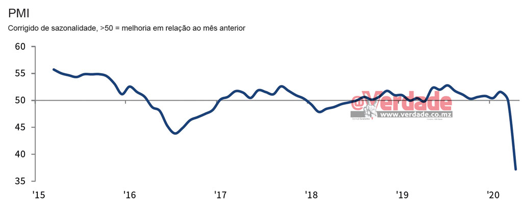 Compilado a partir do inquérito a 400 decisores de empresas privadas a operarem em Moçambique o principal indicador do PMI caiu para 37,1 durante o 1º mês do Estado de Emergência, “uma descida sem precedentes, indicando uma deterioração acentuada na saúde do sector privado em Moçambique. Isto em comparação com um registo de 49,9 em Março, consistente com condições estáveis para as empresas em termos globais”.