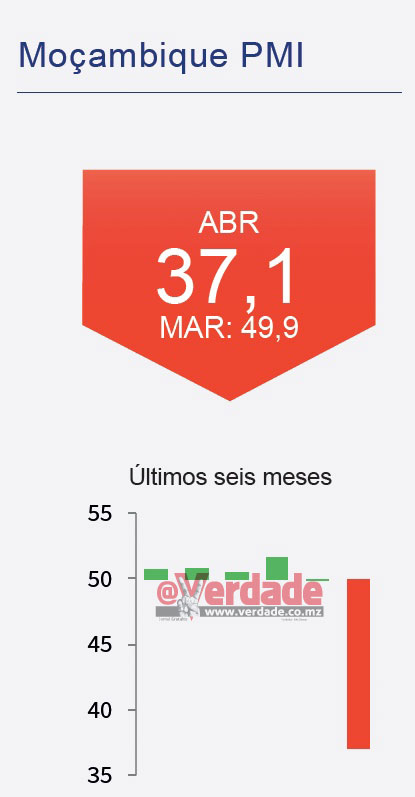 Compilado a partir do inquérito a 400 decisores de empresas privadas a operarem em Moçambique o principal indicador do PMI caiu para 37,1 durante o 1º mês do Estado de Emergência, “uma descida sem precedentes, indicando uma deterioração acentuada na saúde do sector privado em Moçambique. Isto em comparação com um registo de 49,9 em Março, consistente com condições estáveis para as empresas em termos globais”.