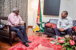 O Presidente da Renamo, Afonso Dhlakama, recebeu neste sábado(07), na unidade hoteleira onde reside quando está na cidade de Maputo, o Presidente de Moçambique, Filipe Nyusi. “O país não terá problemas, porque da maneira como nos conhecemos, como conversámos, tudo correu bem” afirmou Dhlakama após o encontro. O Presidente Nyusi não prestou declarações.