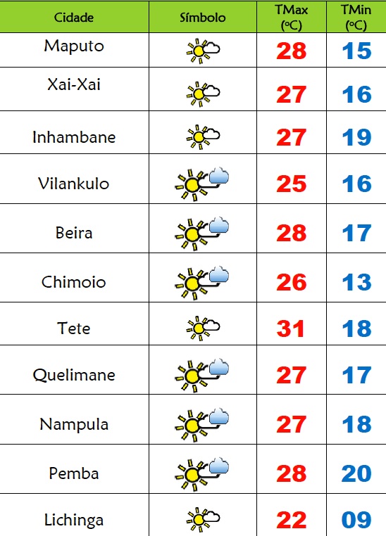 O Instituto Nacional de Meteorologia(INAM) prevê o seguinte estado do tempo para esta quarta-feira(25), Dia da Independência de Moçambique: nas províncias de Niassa, Cabo Delgado e Nampula céu pouco nublado temporariamente nublado; Possibilidade de neblina locais e chuviscos ao longo da costa; Vento de sueste a nordeste fraco a moderado.