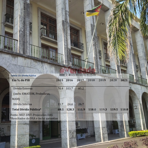 “O total da dívida pública nominal incluindo as garantias de EMATUM, Proindicus e MAM aumentou para 111,9 por cento do PIB em 2017. A composição da divida pública incluindo EMATUM, Proindicus e MAM para 2017 é de cerca de 85,2 por cento do PIB para a dívida externa, 26,7 por cento do PIB para a divida interna” revela o CFMP aprovado pelo Conselho de Ministros em Dezembro passado.