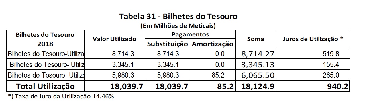 Nos primeiros três meses de 2019 o Executivo emitiu Obrigações do Tesouro da 1ª Série, 2ª Série, 3ª Série, 4ª Série e 5ª Série no montante global de 8,9 biliões de Meticais e ainda Bilhetes do Tesouro no valor de 18 biliões de Meticais.