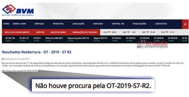 Contudo, ainda no mesmo dia, colocou novamente em leilão as Obrigações do Tesouro 2019 – 7ª Série, para obter 700 milhões de Meticais, pagando juros de 14 por cento, no entanto a BVM indicou que “Não houve procura pela OT-2019-S7-R2”.
