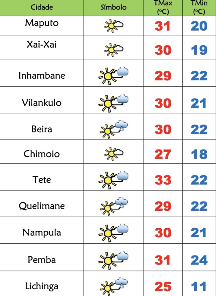 Nas províncias de Inhambane, Gaza e Maputo o INAM prevê céu pouco nublado localmente limpo, possibilidade de neblinas ao longo dos vales; Vento de sueste a nordeste fraco a moderado