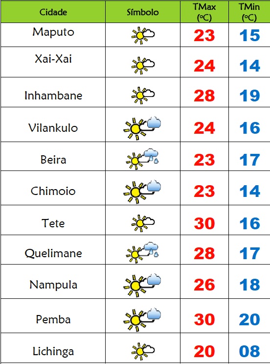 Nas províncias de Inhambane, Gaza e Maputo o INAM prevê céu pouco nublado localmente muito nublado na faixa costeira; Possibilidade de chuviscos locais; Vento de nordeste a noroeste, rodando para sueste, fraco a moderado com rajadas locais.