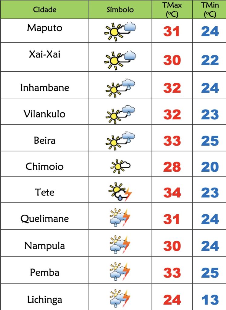 O Instituto Nacional de Meteorologia(INAM) prevê o seguinte estado do tempo para este domingo(22) em Moçambique: nas províncias de Niassa, Cabo Delgado e Nampula céu pouco nublado localmente muito nublado, chuvas em regime fraco a moderado, acompanhadas por vezes de trovoadas; Vento sueste a leste fraco a moderado.