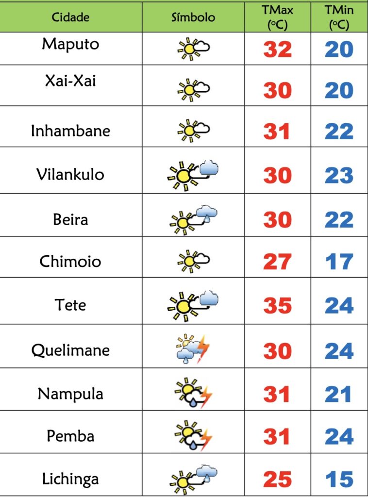 Para as províncias de Tete, Zambézia, Manica e Sofala está previsto céu pouco nublado com período de muito nublado, possibilidade de chuvas fracas localmente moderadas, principalmente na província da Zambézia; Vento de sueste a sudoeste fraco a moderado.