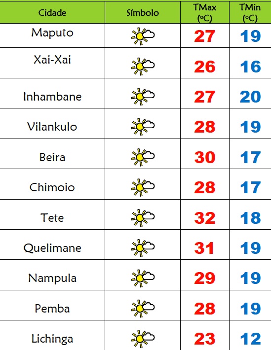 Nas províncias de Inhambane, Gaza e Maputo o INAM prevê céu geralmente nublado; Possibilidade de aguaceiros temporários, e neblinas e nevoeiros matinais; Vento de nordeste a sueste fraco a moderado.