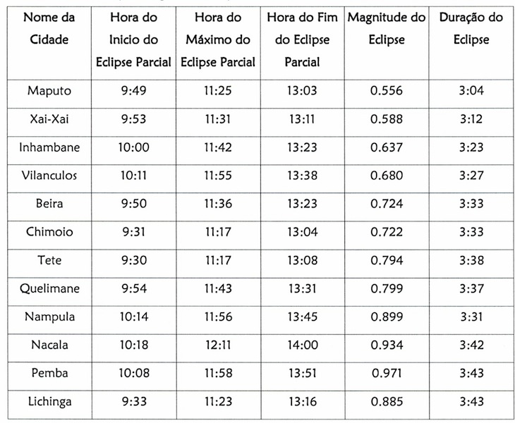 “O centro do eclipse onde o Sol ficará exactamente um anel durante 1 ou 2 minutos passa sobre a ilha do Ibo”, no norte de Moçambique precisa o astrónomo moçambicano que refere que o chamado astro rei poderá será visível na forma de um anel na cidade de Pemba cerca das 11h58.