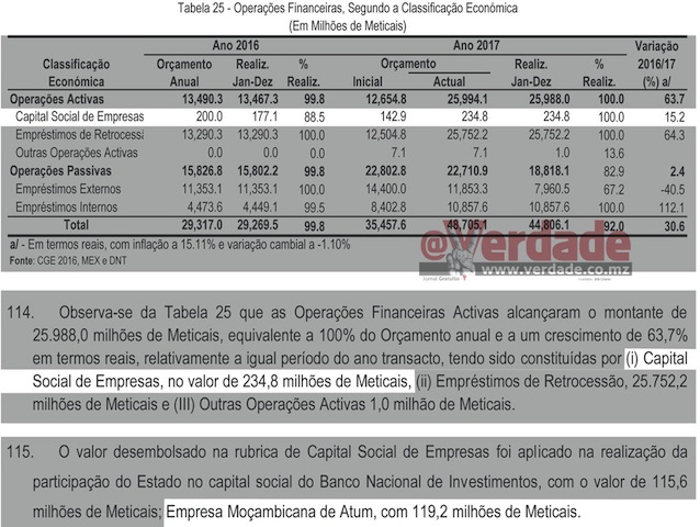 O @Verdade apurou, nos Relatórios de Execução Orçamental, ainda que em 2017 o Governo de Filipe Nyusi injectou 189,2 milhões de meticais na EMATUM em suprimentos e para realizar o Capital Social da falida e inviável empresa.