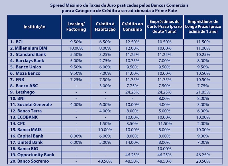 Após mais de dois ano sem alterarem as suas margens, os spreads máximo de risco, mesmo depois do Governo e do Banco de Moçambique terem declarado o início do fim da crise económica e financeira, em Junho alguns bancos comerciais reduziram os custos de alguns produtos de crédito.