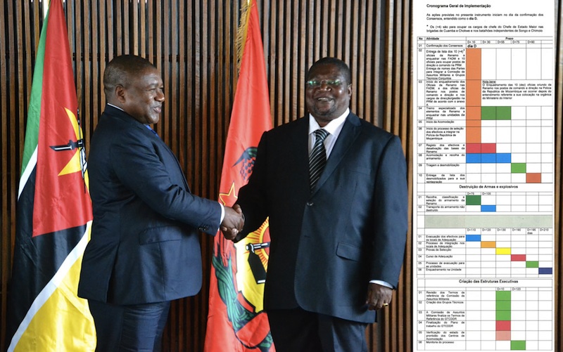 Desde a confirmação dos Consensos, em Agosto de 2018, menos de metade das 22 actividades acordadas foram implementadas: a Entrega de lista dos 10 (+4) oficiais da Renamo a enquadrar nas FADM e 10 oficiais para ocupar postos de direcção e comando na PRM, Entrega de nomes das partes para integrar a Comissão de Assuntos Militares e Grupos Técnicos Conjuntos; Revisão dos Termos de referencia da Comissão de Assuntos Militares; Criação dos Grupos Técnicos; A Comissão de Assuntos Militares finaliza os Termos de Referência do Grupo Técnico Conjunto para o Desarmamento, Desmobilização e Reintegração (GTCDDR); Início do enquadramento dos Oficiais da Renamo nas Forças Armadas de Defesa de Moçambique.