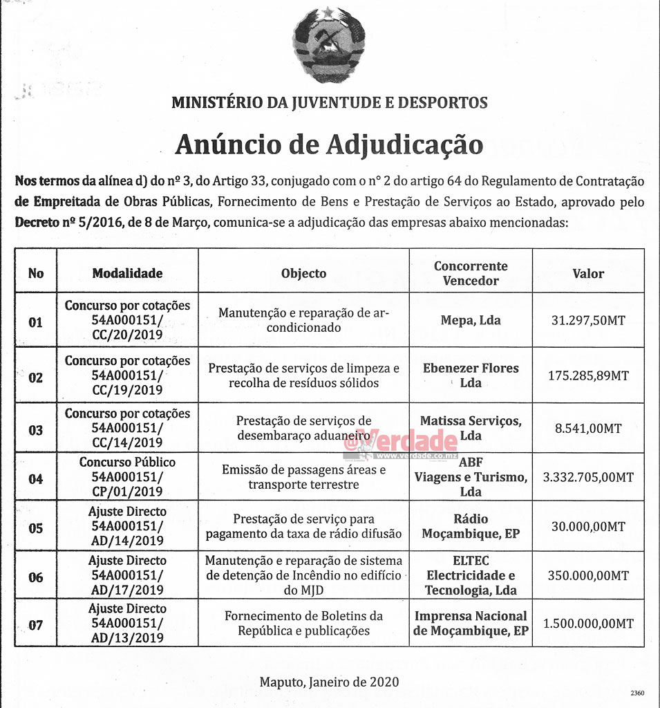 Entretanto o Presidente Nyusi ainda não definiu as atribuições e competências da Secretaria de Estado do Desporto e enquanto isso o extinto Ministério da Juventude e Desportos continua a realizar despesas cuja justificação é duvidosa como é o caso da adjudicação de passagens aéreas e terrestres no valor de 3,3 milhões de meticais ou a entrega por ajuste directo de 1,5 milhão de meticais alegadamente à Imprensa Nacional para o fornecimento de Boletins da República.