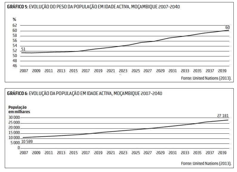 Contudo, na “eventualidade de a futura força de trabalho moçambicana ter acesso a formação académica e a preparação profissional relevante e com qualidade, ela irá exercer uma pressão transcendental sobre a capacidade dos recursos da economia em absorvê-la no mercado laboral. O ritmo do aumento da demanda por postos laborais poderá superar largamente a oferta se se mantiverem inalteradas as características estruturais da economia moçambicana. Haverá uma grande necessidade de providenciar postos de trabalho seguros, decentes e, sobretudo, produtivos, para o capital humano acumulado poder efectivamente produzir o bónus demográfico esperado”.