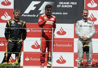 O piloto da Ferrari Fernando Alonso venceu o Grand Prémio da Europa em Valência, marcando a primeira vitória repetida na temporada de 2012 da Fórmula 1. O finlandês Kimi Raikkonen ficou em segundo pela Lotus e Michael Schumacher, da Mercedes, ficou em terceiro.