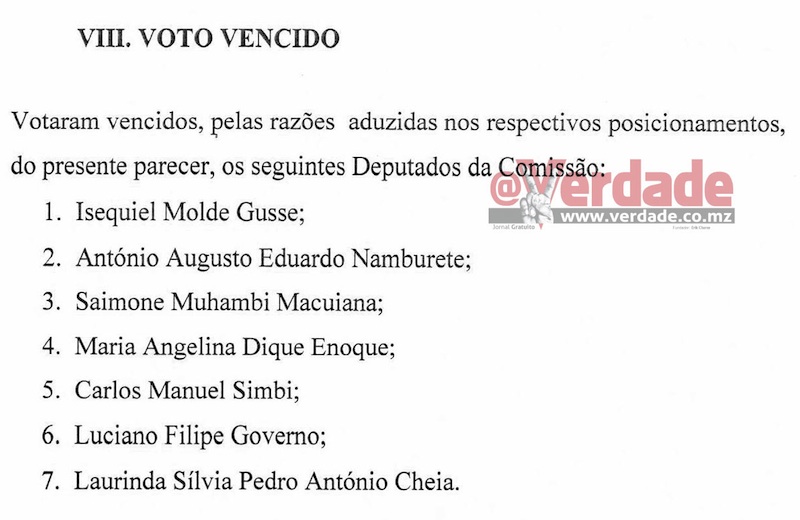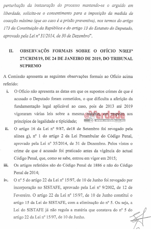 “O Grupo Parlamentar do MDM na Comissão considera que a Assembleia da República não pode anuir a solicitação do Tribunal Supremo, nos termos em que a faz, uma vez tratar-se de um pedido de consentimento para a imposição de medida de coação máxima(prisão preventiva) fora de flagrante delito, tendo em consideração o plasmado no nº 1 do artigo 173 da CRM que impõe que apenas há lugar a detenção ou prisão nos casos de flagrante delito, o que no caso em análise fere esta disposição constitucional”, pode-se ler no Parecer da 1ª Comissão do Parlamento a que o @Verdade teve acesso.