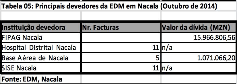 Na óptica do MDM, a “influência política inaceitável numa empresa com autonomia administrativa e financeira é a protecção que o Governo exerce sobre os clientes devedores da EDM. Esta protecção é feita sobretudo às instituições públicas que não pagam a corrente eléctrica consumida, às vezes com quase um ano de atraso, mas que a EDM é impedida de fazer cobranças coercivas. Em Nacala, por exemplo, destacam-se entre os maiores devedores o SISE, a Base Área, o Hospital Distrital e o FIPAG com valores bastante altos”.