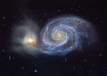M51 (Galáxia do Cata-vento ou NGC 5194). Galáxia espiral do tipo Sc, a 37 milhões de anos-luz da Terra, na constelação de Cães de Caça. Magnitude aparente 8.4. A companheira mais pequena é NGC 5195.