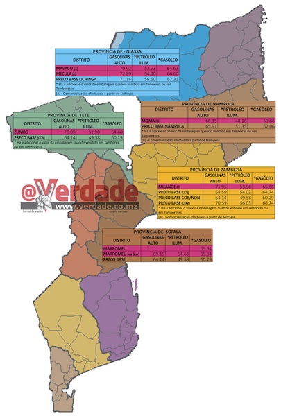 Na província de Cabo Delgado os preços mais acessíveis são praticados na cidade de Pemba e no distrito de Mecúfi, gasolina a 65,01 meticais, petróleo a 50,45 meticais e o gasóleo a 61,16 meticais. Já no planalto de Mueda, onde começou a luta pela independência nacional, a gasolina é vendida 67,50 meticais, o petróleo a 52,94 e o litro de gasóleo custa 63,65 meticais.