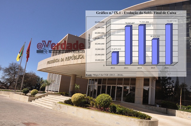 “Para o ano de 2015, transitou o saldo de 71.521.888 mil meticais e o final foi de 46.438.000 mil meticais, valor com que se abriu o ano de 2016, que equivale a 23,2 por cento das despesas totais do exercício. O saldo final de 2016 foi de 73.307.340 mil meticais, significando um aumento em relação ao ano anterior e equivalendo a 33,2 por cento das despesas”, constatou o Tribunal Administrativo (TA) no seu Relatório e Parecer sobre a Conta Geral do Estado de 2016.