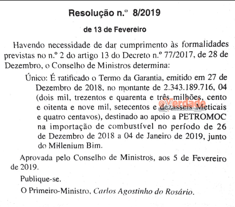 Entretanto já próximo do fim do ano passado o Governo financiou novas importações de combustíveis desta vez emitindo Termos de Garantia à favor da Petróleos de Moçambique (Petromoc). A 27 de Dezembro passado foi emitido um Termo de Garantia junto do Millenium Bim no valor de 2.343.189.716,04 meticais. Na mesma data foi emitido outro Termo de Garantia junto do Banco Comercial e de Investimentos no montante de 1.868.012.959,39 meticais.