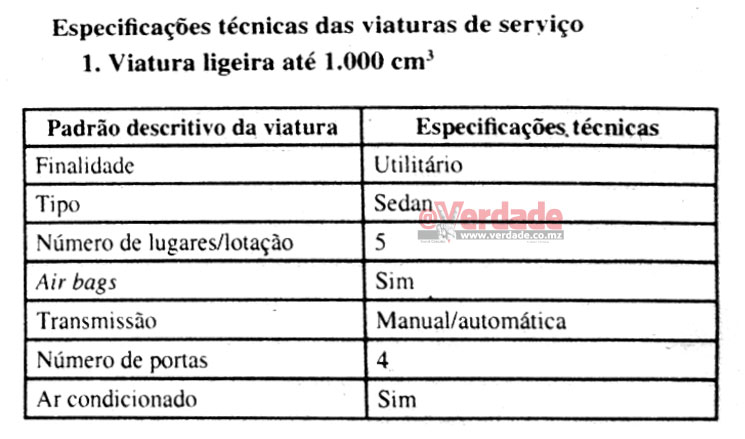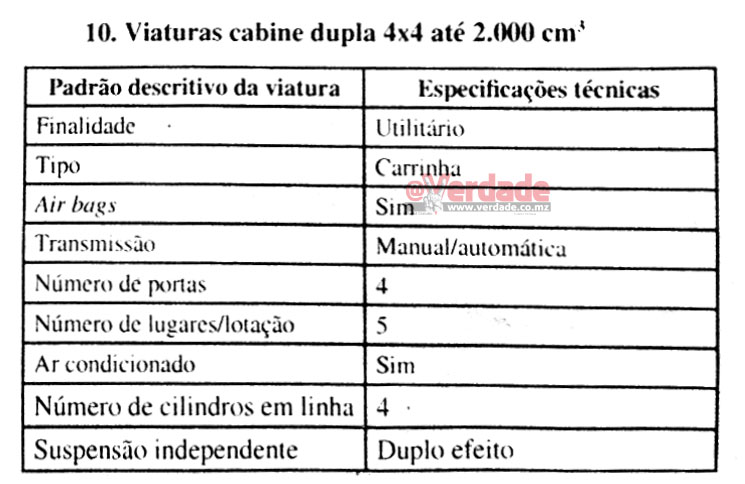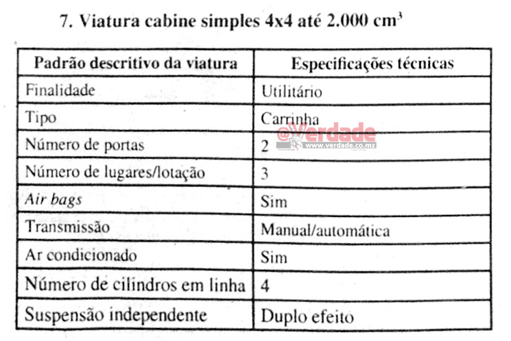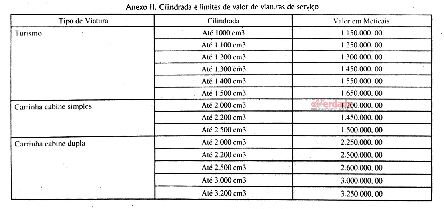 Até 1000 centímetros cúbicos o limite é de 1,1 milhão de Meticais enquanto para a cilindrada mais alta, entre os carros de turismo o Estado vai pagar 1,6 bilião de Meticais. Para as viaturas de cabine simples 4×4 o valor mais baixo a pagar são 1,2 milhão, até 2.000 centímetros cúbicos, e 1,5 milhão, até 2.500 centímetros cúbicos. Relativamente às carrinhas de cabine dupla o Estado admite pagar 2,2 milhões de Meticais até 2.000 centímetros cúbicos e o valor máximo de 3,2 milhões de até 3.200 centímetros cúbicos.