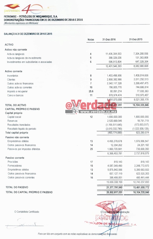 A Petromoc fechou o exercício económico de 2016 em situação de falência técnica, “O capital próprio da Sociedade representa menos da metade do capital social” enfatizou o Auditor Independente das demonstrações financeiras que o @Verdade revelou em exclusivo.