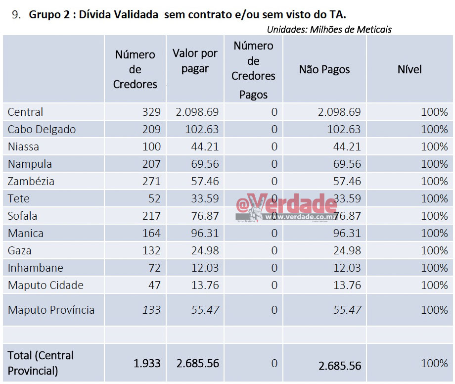 O @Verdade apurou que são 2,7 biliões de meticais que vão ser pagos a 209 empresas sediadas na Província de Cabo Delgado, 100 na Província do Niassa, 207 na Província de Nampula, 271 na Província da Zambézia, 52 na Província de Tete, 217 na Província de Sofala, 164 na Província de Manica, 132 na Província de Gaza 132, 72 na Província de Inhambane, 133 na Província de Maputo e 47 na Cidade de Maputo. Porém o “bolo” maior, 2 biliões de meticais, serão pagos a 329 “empresas a nível central”.