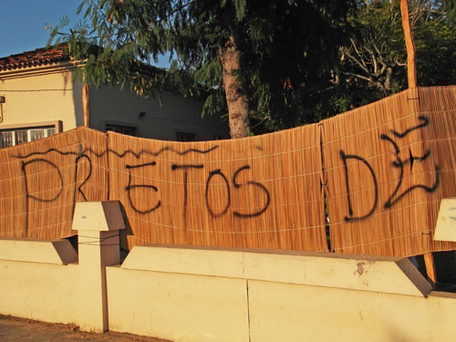 No domingo chegámos ao sítio e sentimos na pele de um agente da Polícia que tinha à sua frente todos os elementos do delito e o próprio criminoso a festejar a façanha. Antes de falar com o “criminoso”, fotografou vorazmente os “painéis”, incrédulo e revoltado com o que estava a constatar com os próprios olhos. E alguns jovens ainda estavam lá, a celebrar com as “últimas garrafas” na mão.