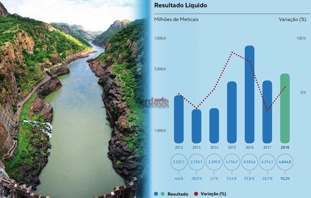 Com estes números, e apesar de vender à Eskom 68,9 por cento dos 13.659,13 GWh de energia que produziu em 2018, o Resultado Líquido da HCB cresceu em somente 10,2 por cento, passou de 4,2 biliões em 2017 para 4,6 biliões Meticais.