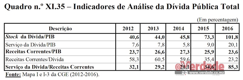 Sobre a Dívida Pública a 2ª Comissão destaca que “Os indicadores de sustentabilidade da Dívida Pública ultrapassaram os limites estabelecidos pelo Banco Mundial e FMI”, sem no entanto referir que tal aconteceu porque as dívidas ilegais da Proindicus, EMATUM e da MAM já estão a ser contabilizadas como Dívida do Estado moçambicano no seguimento da sua incorporação na Conta Geral do Estado de 2014 e de 2015 pelos deputados do partido Frelimo.