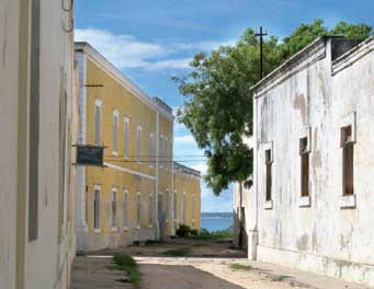 Ao contrário do que se imagina quando se fala de uma ilha, este território pode ser atingido via terrestre. Para isso tem de se percorrer uma estreita e ferrugenta ponte de 3,5 quilómetros construída pelos portugueses nos idos de 60. Há, por isso, quem defenda que a Ilha de Moçambique, não é verdadeiramente uma ilha. O que seja não importa. É um território de três quilómetros de comprimento com uma largura de 200 metros no ponto mais estreito e 400 metros no mais largo, orientado no sentido nordeste/sudeste à entrada da Baía de Mossuril. Sob o ponto de vista arquitectónico a ilha está dividida em duas: a “cidade de pedra” e a “cidade de macuti”. A primeira possui cerca de 400 edifícios (incluindo os principais monumentos); a segunda, na metade sul da ilha, conta com 1.200 habitações de construção precária maioritariamente de caniço. Depois da Independência, a guerra foi responsável pelo sobrepovoamento da ilha, que hoje possui 10 mil habitantes, três vezes mais do que em 1975. Presentemente, existe um plano de realojamento do lado continental para mais de 6 mil pessoas, mas as autoridades debatem-se com a relutância das populações em abandonar as suas casas degradadas. O saneamento básico é um problema grave e as defecções no mar são constantes. Desde que a ilha foi declarada Património da Humanidade pela UNESCO, em 1992, pouco se tem feito em relação à recuperação de edifícios históricos. Salvo uma ou outra excepção, na qual se inclui a presente reabilitação da Fortaleza de S. Sebastião pela UNESCO com apoio da Cooperação Portuguesa, a ruína é geral. Mas mesmo nesta degradação, mesmo neste abandono, o charme e o encanto resistem em cada recanto, em cada esquina.