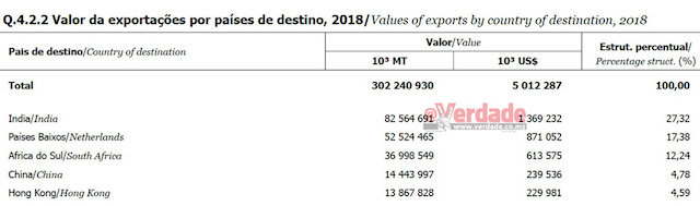 Há dois anos que o país asiático assumiu a liderança nas compras em Moçambique fundamentalmente devido a aquisição do carvão mineral que é produzido na Província de Tete. No ano passado, segundo o Instituto Nacional de Estatística, a Índia foi responsável por 1,4 bilião de dólares em exportações, 27,32 por cento do total, no entanto menos do que o 1,6 bilião de dólares que gerou em 2017.