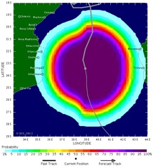 Segundo o INAM, o ciclone tende a deslocar-se para o sul do canal podendo afectar a província de Maputo com aguaceiros fracos (menos de 10 mm em 24 horas) e ventos fortes (superiores a 60 km/h) principalmente nos distritos costeiros (Manhiça e Marracuene).