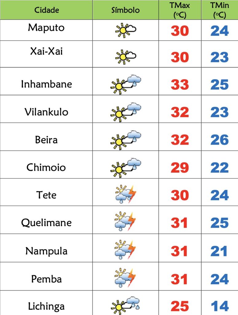 Para as províncias de Tete, Zambézia, Manica e Sofala está previsto céu nublado localmente muito nublado, ocorrência de aguaceiros acompanhados de trovoadas em Tete e Zambézia; Vento de sueste fraco a moderado.