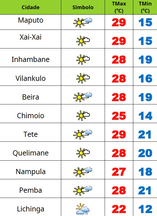 Para as províncias de Tete, Zambézia, Manica e Sofala está previsto céu pouco nublado localmente nublado; Possibilidades de chuviscos locais; Ocorrência de neblinas ou nevoeiros matinais; Vento de sueste a leste fraco a moderado.