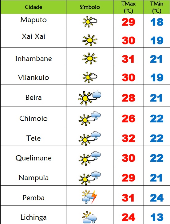 Nas províncias de Inhambane, Gaza e Maputo o INAM prevê céu geralmente limpo; Possibilidades de banco de nevoeiros ou neblinas matinais ao longo dos vales; Vento de nordeste a noroeste fraco a moderado.