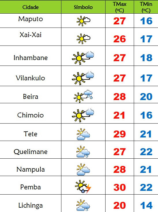 Para as províncias de Tete, Zambézia, Manica e Sofala está previsto céu pouco nublado localmente muito nublado; Continuação de ocorrência de chuvas fracas localmente moderadas principalmente nos distritos costeiros e norte da província de Tete; Vento de sueste a leste fraco a moderado, soprando por vezes com rajadas.