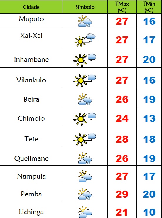 Para as províncias de Tete, Zambézia, Manica e Sofala está previsto céu pouco nublado localmente muito nublado; Possibilidade de chuvas fracas ao longo da faixa costeira; Neblinas e nevoeiros matinais locais; Vento de sueste a sudoeste fraco a moderado.