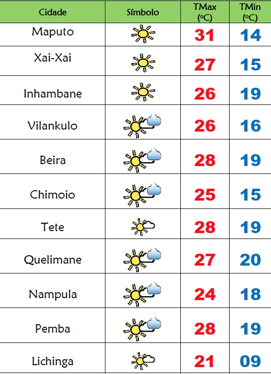 Para as províncias de Tete, Zambézia, Manica e Sofala está previsto céu pouco nublado localmente muito nublado, possibilidade de chuviscos ou chuvas locais nos distritos localizados ao longo da faixa costeira; Neblina e nevoeiro, principalmente ao longo dos vales. Vento de sueste a nordeste fraco a moderado.