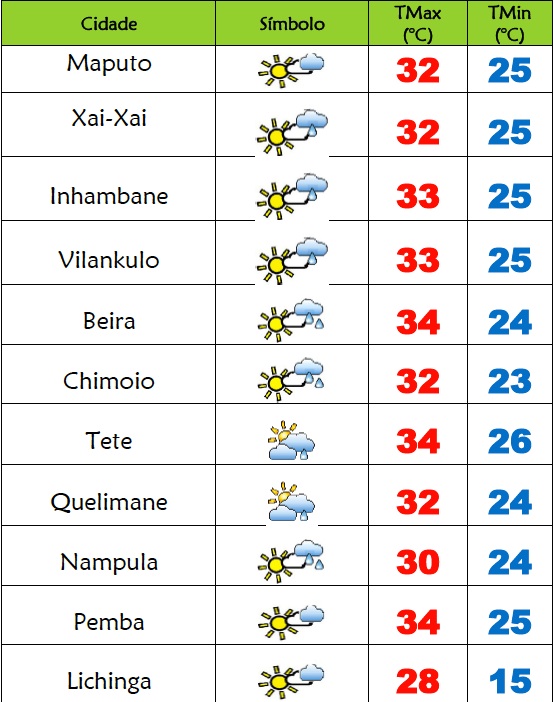 Nas províncias de Inhambane, Gaza e Maputo o INAM prevê continuação de tempo quente e húmido, com céu predominantemente pouco nublado; Possibilidade de chuvas fracas ou chuviscos intermitentes no litoral de Gaza e Inhambane; Vento de sueste a sudoeste com intensidade fraca moderada.
