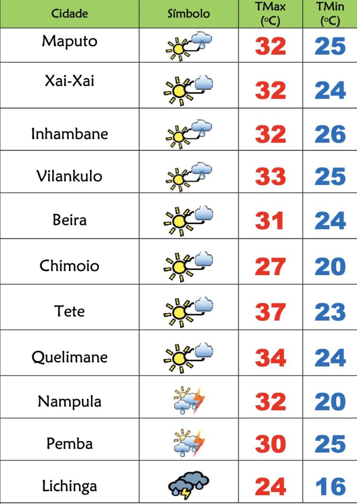 Nas províncias de Inhambane, Gaza e Maputo o INAM prevê céu pouco nublado localmente nublado, possibilidades de chuvas fracas ao longo dos distritos costeiros; Vento de nordeste a sueste fraco a moderado